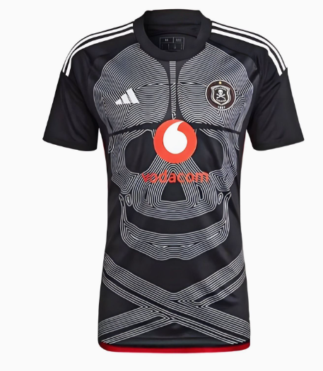 The Adidas Orlando Pirates FC 2023/24 home football shirt features a striking design and is black with a huge skull graphic on the front. The 3 Stripes and Adidas logos are white.