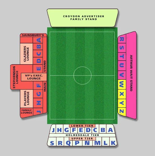 1. The Main Stand (also called the Holmesdale Road Stand) which runs along the length of the pitch. It is the largest stand in the stadium and houses the club’s administrative offices and hospitality suites.