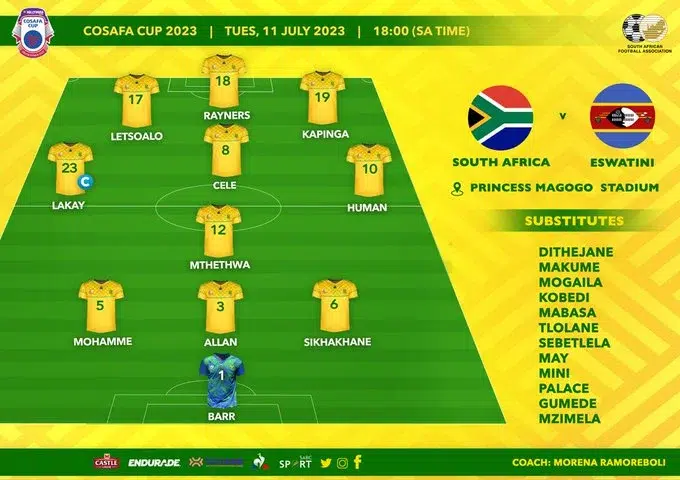 Starting lineup for South Africa National Soccer Team vs Eswatini National Football Team, Timeline and Standings for this COSAFA Cup 2023.